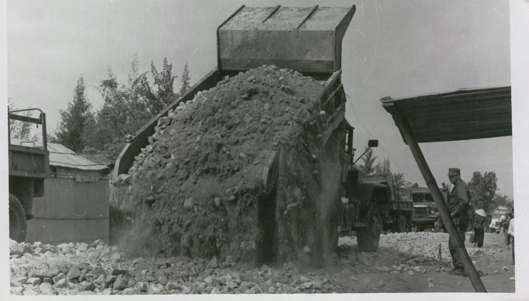 Dumping a load of crushed rock and dirt on Route # 1 1967. Millions of tons of this stuff was dumped. When we started the road it was 3 feet under sea level and only one lane wide. The road was about 50 miles long.