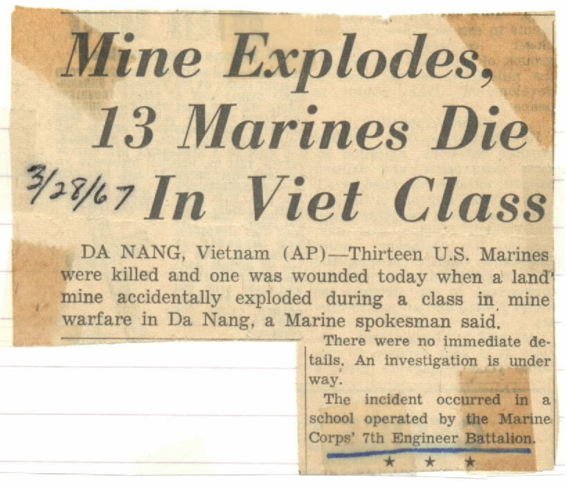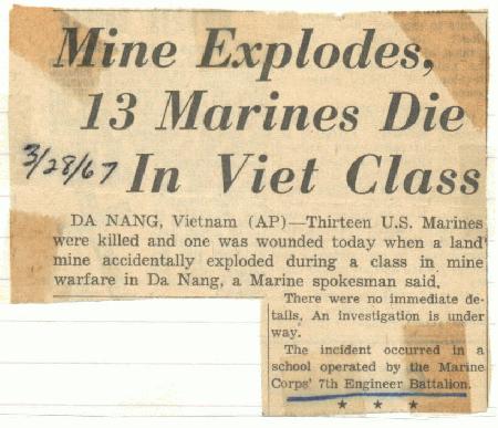 Mine School Accident. School was in Danang and a mine exploded during a demonstration and 13 Marines were killed. Two of the Marines attending the school were 9th Engineers. Stevens and Schockley.