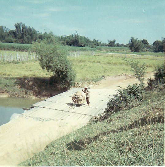 Vietnamese man pushing his bike loaded with rice bags. Shortly after photo taken he was caught under the wheels of a loaded dump truck and killed.
