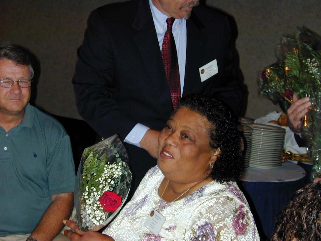 Wife of KIA "Heavy" Savre presented with roses. Eddie Posey to left and Harry Parmer in rear