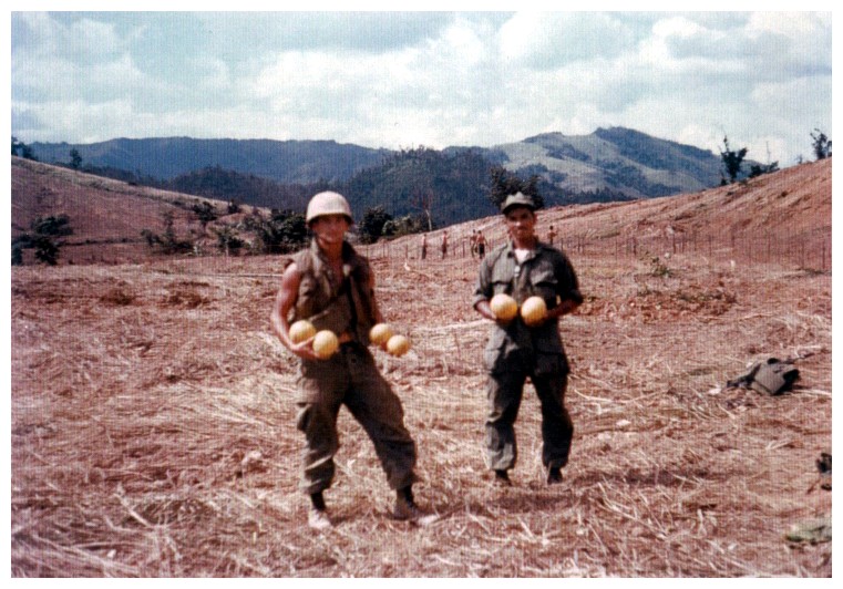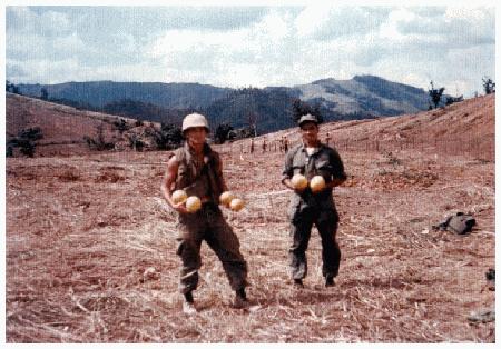 Sgt. Fred Jura and Unk collecting mellons? at Ca Lu, Delta Company, 1967.